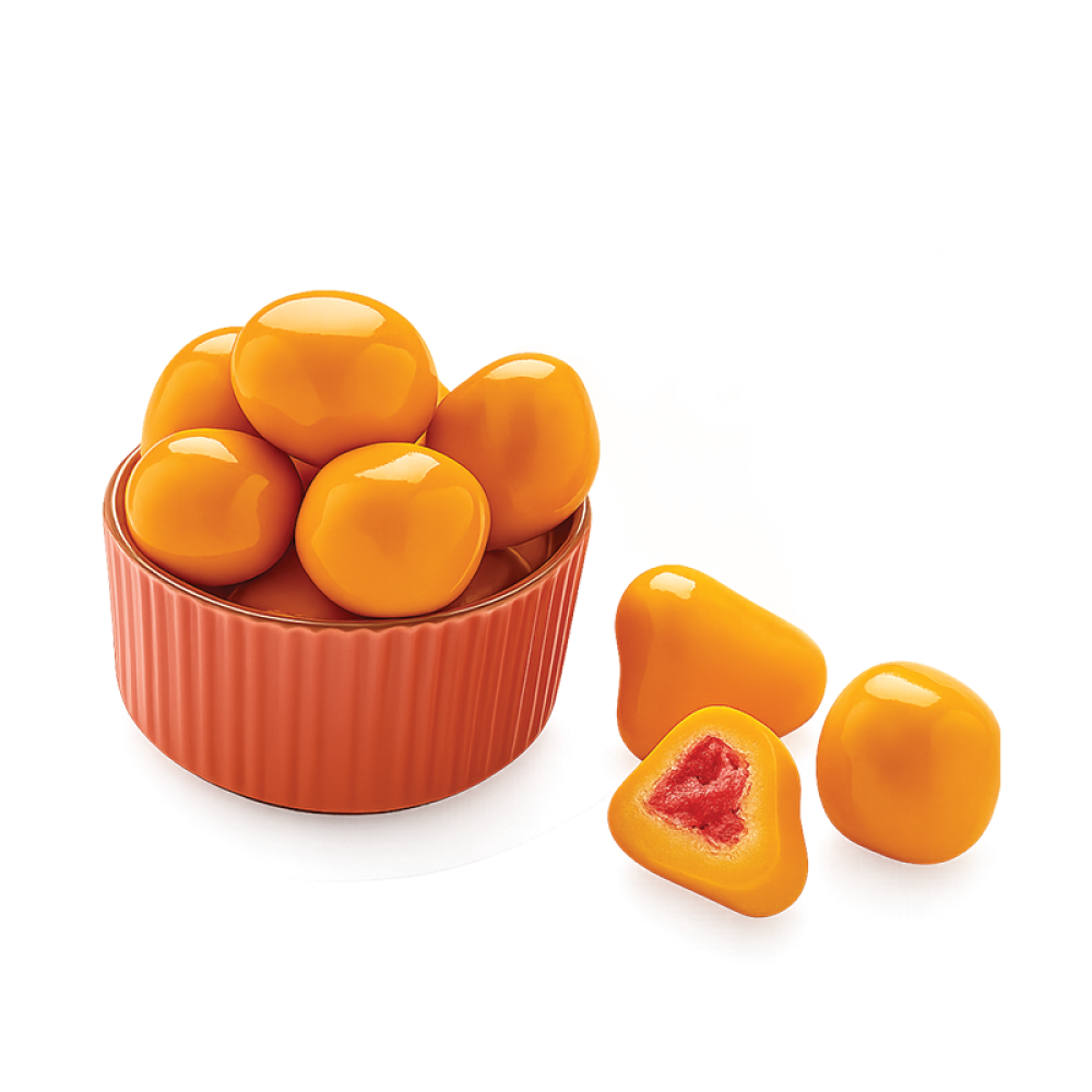 شكل ناعم ولامع من الخارج بالمانجو والداخل حشوة فراولة مجففة، كما هو موضح بالصورة